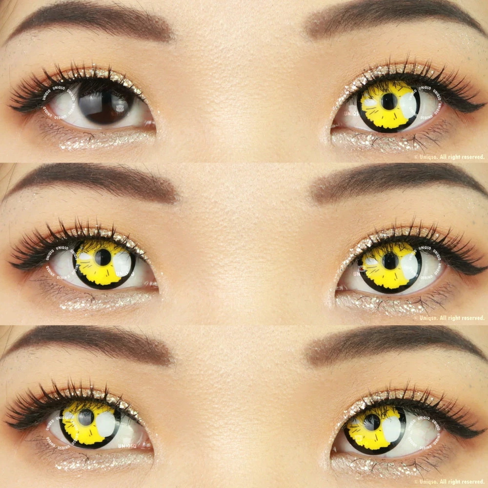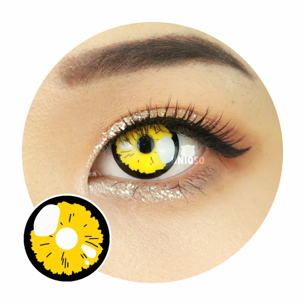 Get ready to transform into your favorite anime character with these vibrant yellow anime contact lenses. Featuring a bold black rim and white spot, these lenses perfectly mimic the distinct look of anime eyes. Available in prescription strengths up to -7.00, they are perfect for both vision correction and cosplay. Make your cosplay stand out with these must-have anime contact lenses.